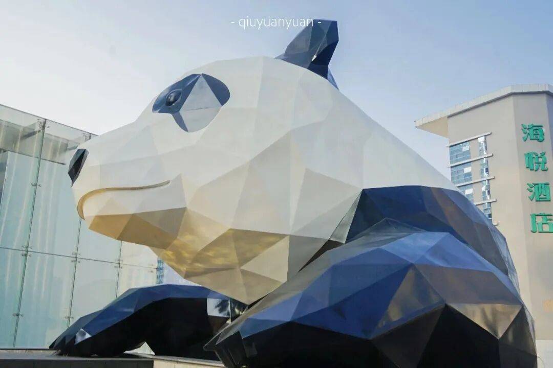 立正在外墙的巨型熊猫雕塑成为外埠旅客来蓉必
